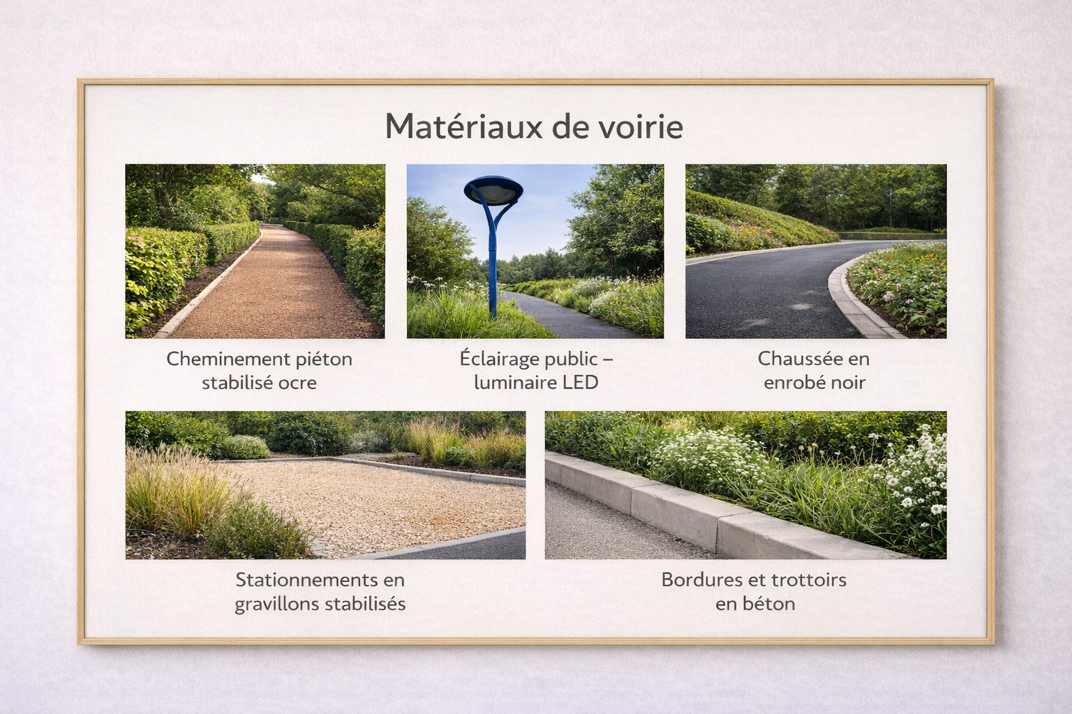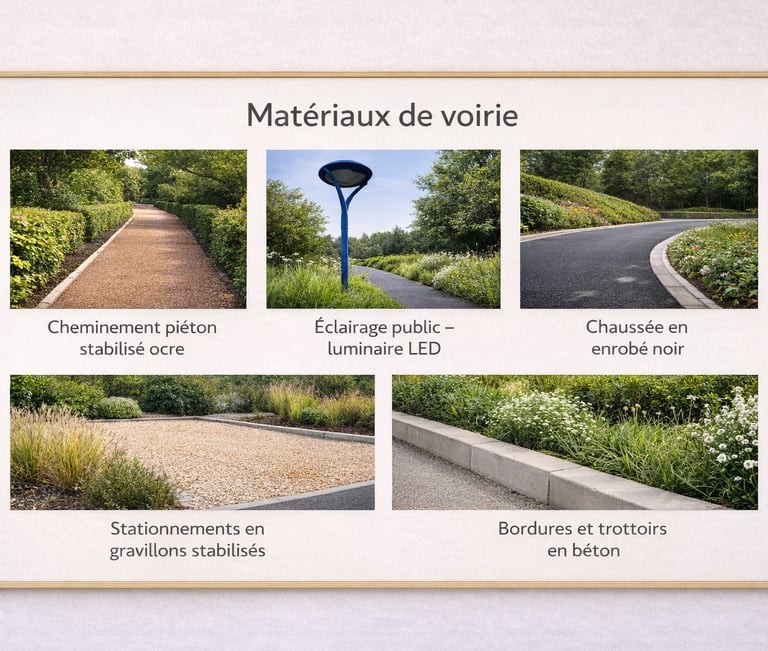 Les chaussées sont réalisées en enrobé noir, accompagnées de trottoirs et bordures en béton assurant sécurité et accessibilité. Les cheminements piétons en stabilisé ocre facilitent les déplacements doux, tandis que les stationnements en gravillons stabilisés s’intègrent harmonieusement à l’environnement. L’ensemble est complété par un éclairage public LED garantissant confort et visibilité.